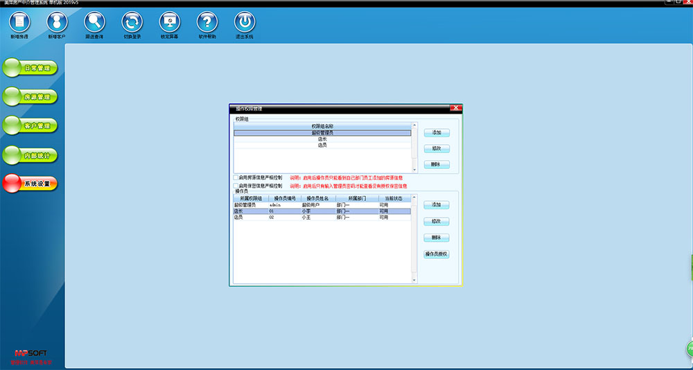 2、操作员权限化分细致,有效保证房源资料的安全。
