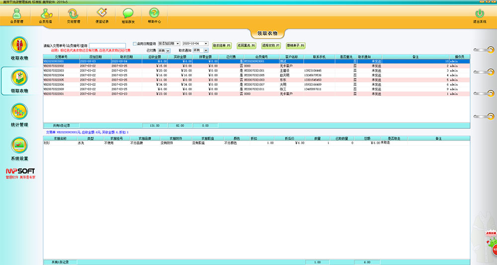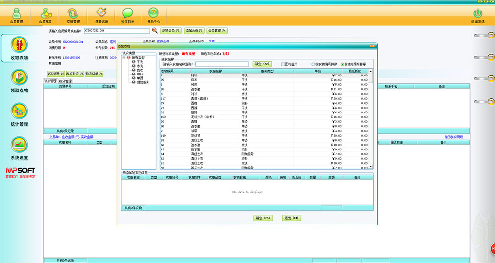 2、简易,快捷,灵活的取衣功能。根据客户的小票或其它凭证,显示衣物的详细信息(包括衣服的颜色,附件,品牌,瑕疵,挂衣号和洗衣类型等),可以迅速查询到衣服的具体位置,可以简易,快捷的 取走衣物。同时,顾客可以单件或部分取衣,允许顾客先取走同一单据下的部分衣物。